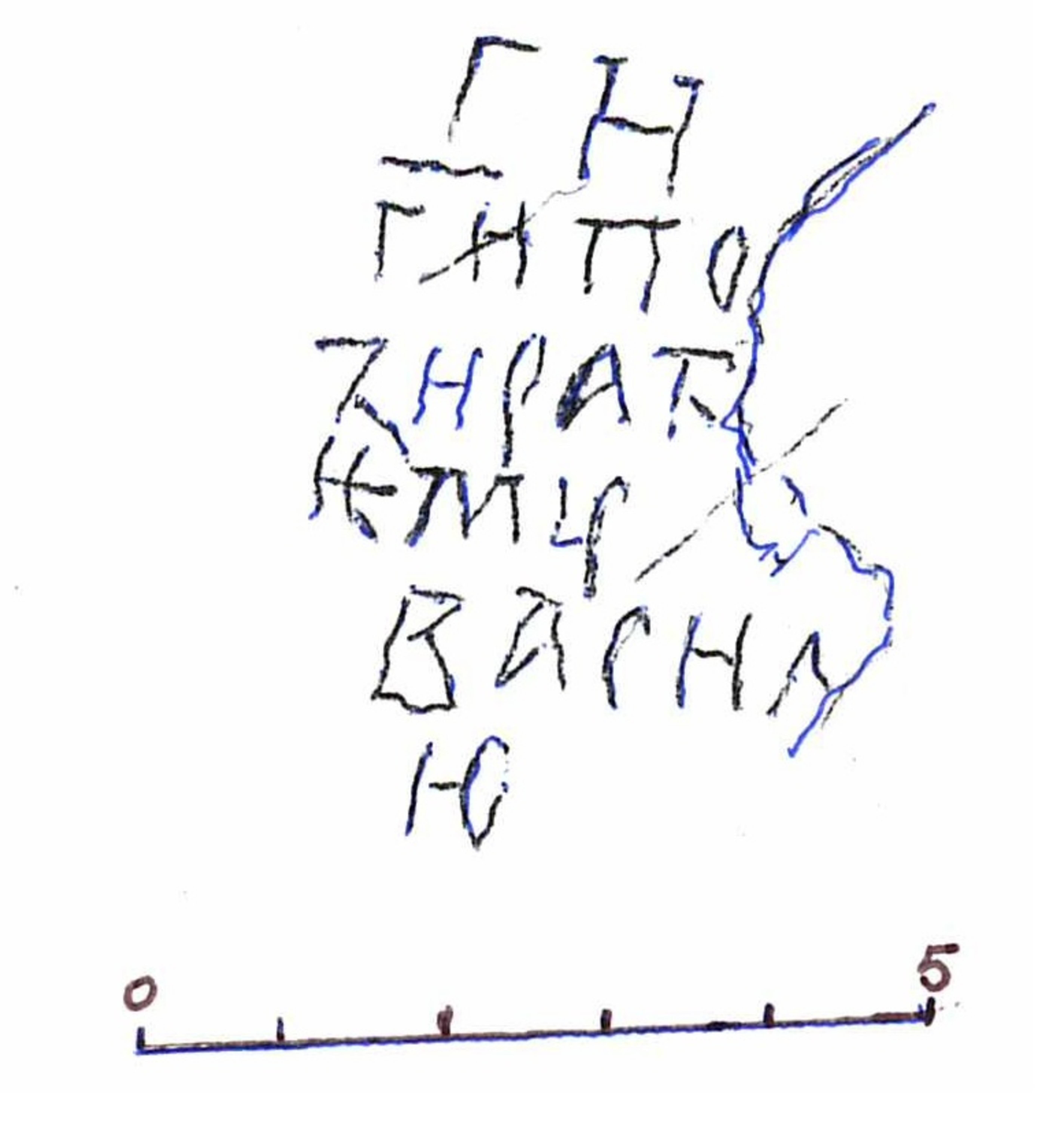 | Комментарий к прочтению | Титло, согласно Т. А. Рождественской, отсутствующее в 1-й строке, можно видеть в той горизонтальной линии, в которую упирается надпись о Кюриле и Оксении. Над ги (Господи) в первой строке титла нет, а во второй строке есть. (Рождественская 2016б) |