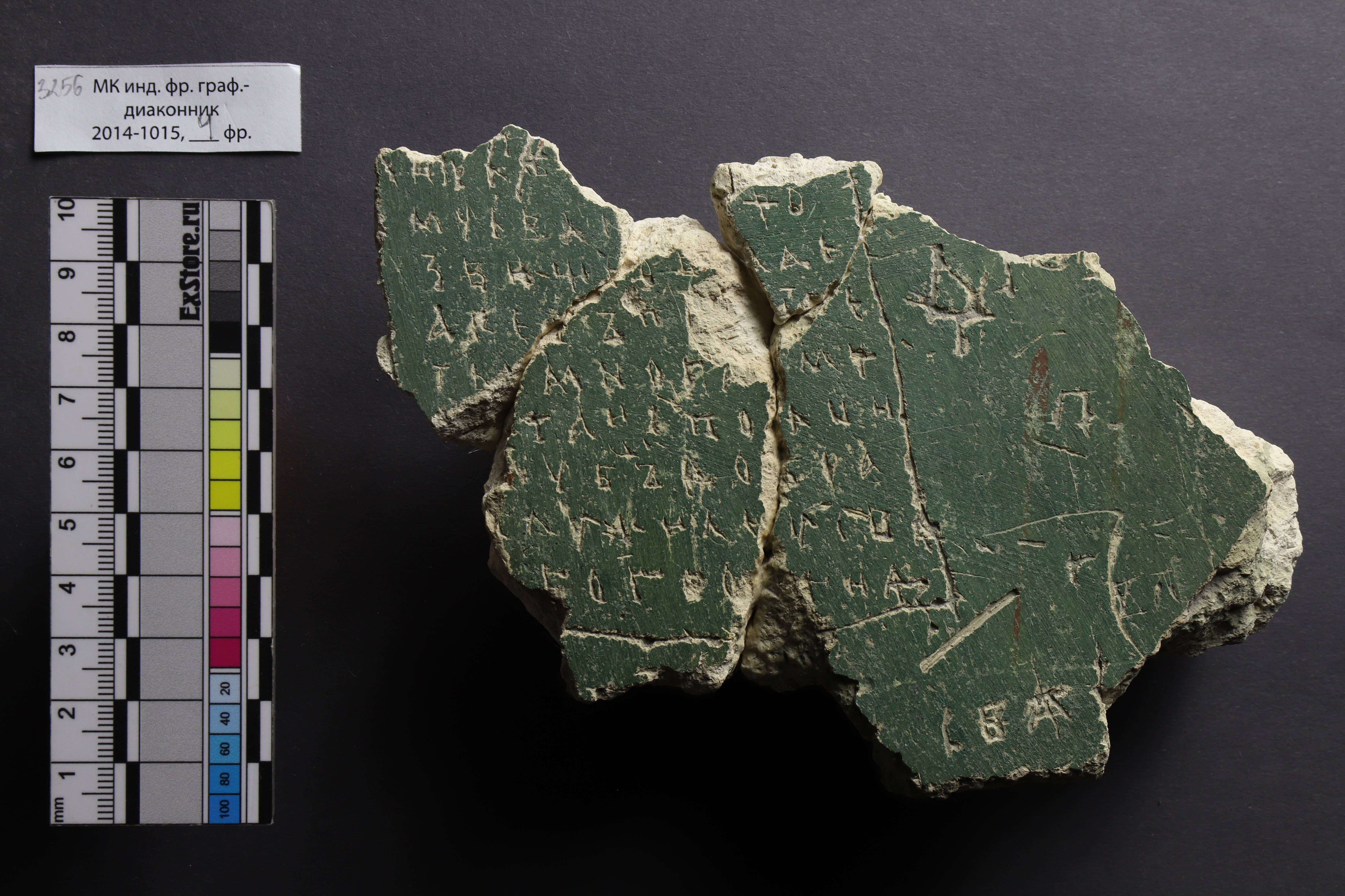 | Расположение на носителе | Фрагмент 3256* найден в Южной апсиде. «Блок-монолит из четырех кусков штукатурки зеленого цвета. Направление кисти переменчивое, но преимущественно диагональное (слева направо, сверху вниз). Есть незначительные повреждения штукатурки – в основном точечные выбоинки, выпавшие соломинки, случайные царапины. В правой части есть два тонких мазка красно-коричневой краской. Возможно, рядом был угол. Здесь же красочный слой чуть истерся». (Гиппиус, Щеголькова 2024) |