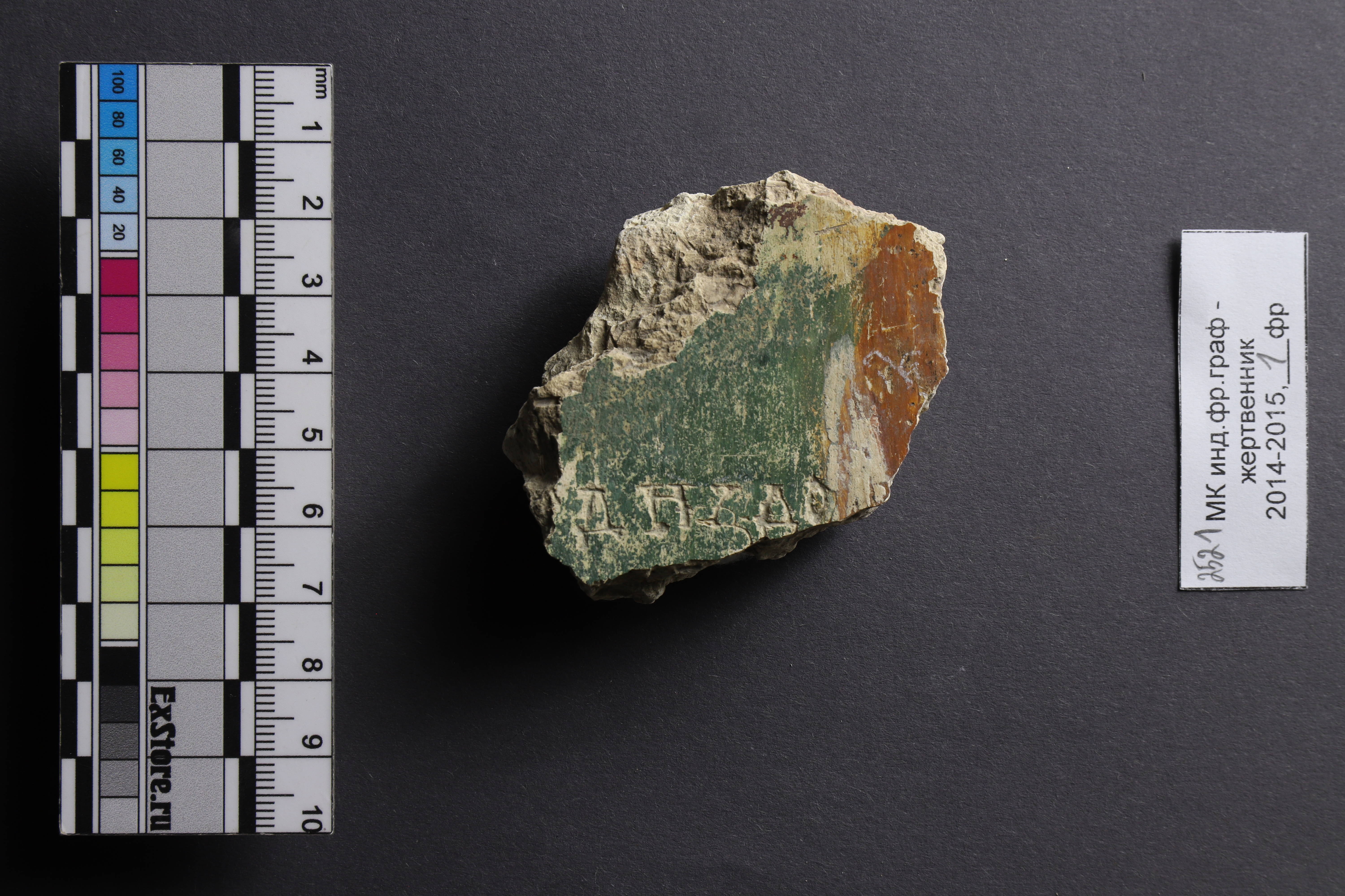 | Расположение на носителе | Фрагмент 2521 был найден в северной апсиде. «Фрагмент трехцветный; однострочная надпись начиналась на зеленом фоне, пересекала белую вертикальную полосу разгранки и заходила на красный фон». (Гиппиус, Щеголькова 2024) |