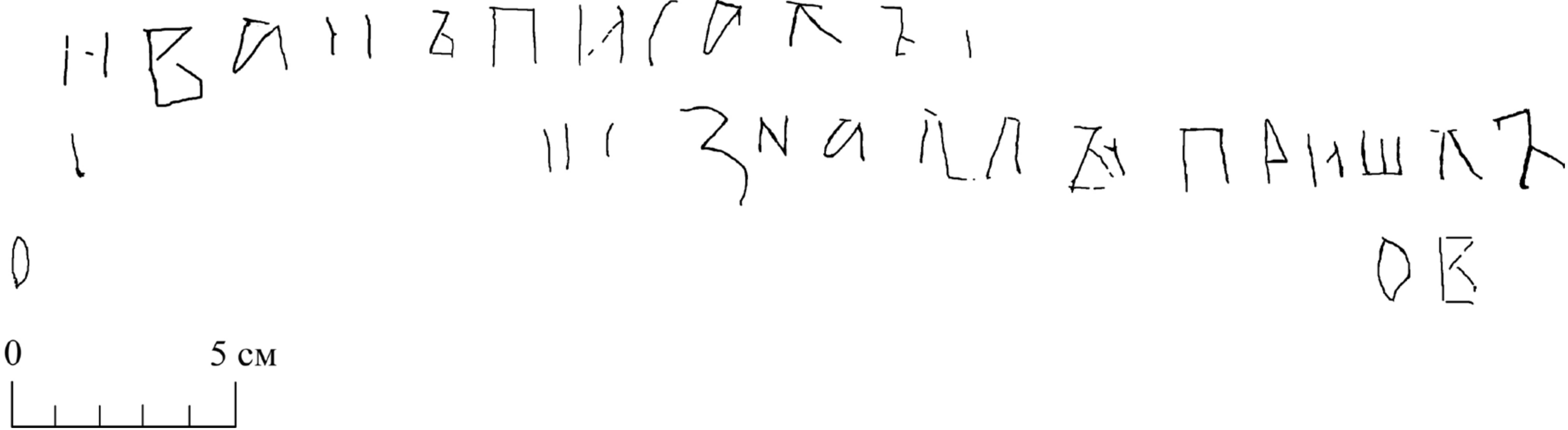 | Датировка по палеографии и языку | а – Iб; в – III; з – IIIа, и – II; л – 1; м – 6; н – Iа; о – I, п – I; р – IVб; c – I; ш – I; ъ – III. Граффито обладает признаками, указывающими на его позднее происхождение. К ним следует отнести палеографию и (наклонная перекладина) и ъ (петля с двумя изломами) [Рыбаков, хронологический график для букв и, ъ; Высоцкий, 1976, с. 160, 174–175]. Похожие написания з, и, р, н встречаем в граффито № 49 из церкви Спаса на Нередице, которое датируется концом XIV – первой половиной XV в. (Рождественская 1992, 94). Близкую хронологию дает палеография берестяных грамот (датирующие признаки: и – «наклонная перекладина», м – «петля с двумя изломами», р – «петля углом вниз, прямолинейное» (Зализняк 2000: 171, 179, 183). За исключением модели л («с покрытием»), сравнительно частое использование которой фиксируется в XI – конце XIII в., написание остальных букв не противоречит указанной датировке. Учитывая, что л «с покрытием» еще встречается в середине XIV в., время выполнения надписи можно скорректировать в пользу середины XIV – начала XV в. Близкую аналогию в начертании з, м, н, р обнаруживает берестяная грамота № 414, стратиграфическая дата которой – 40–60-е гг. XIV в. (Артамонов, Гиппиус 2023) |