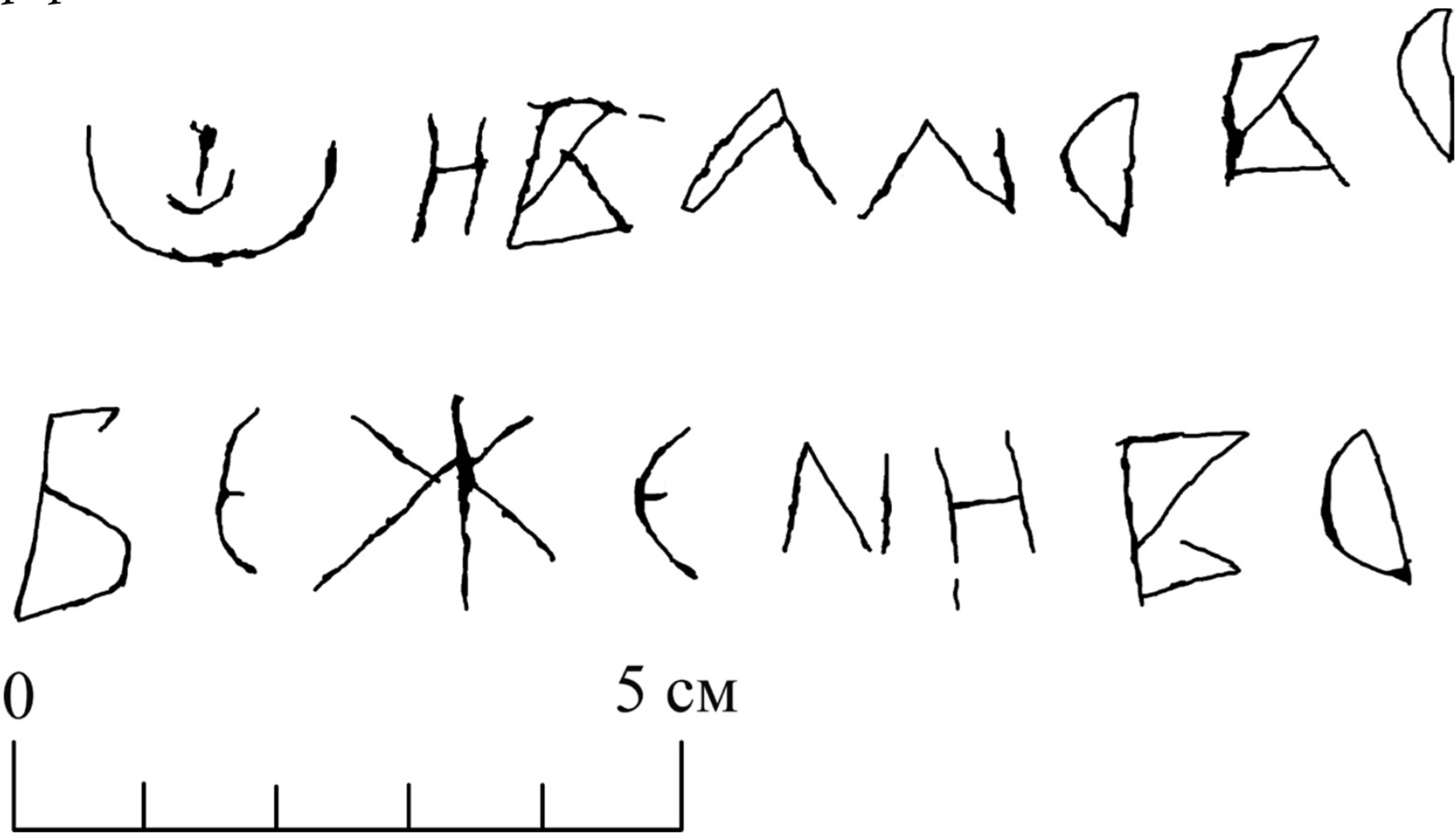 | Датировка по палеографии и языку | а – Iа; б – I; в – III, 3; е – I; ж – IVa; и – I; н – I; о – 4. Для граффито характерны архаические модели а, б (округлая петля), в, е, и (горизонтальная перекладина в середине), н (диагональ) [Рыбаков, хронологический график для букв а, б, в, е, и, н; Высоцкий, 1976, с. 150, 160]. В начертании а, б, е, и близкую аналогию обнаруживает надпись № 28 из собора Святой Софии в Киеве, которую издатель датирует периодом княжения Святополка Изяславича (1093–1113 гг.) [Высоцкий, 1966, с. 80–81, табл. XXXI, 1]. Схожую модель в использует автор граффито № 65 из Новгородской Софии, время его выполнения – вторая половина XI – первая половина XII в. [Медынцева, с. 69, рис. 49]. Палеография берестяных грамот указывает на XI–XII вв. (датирующие признаки: б – «округлая петля», в – «большой верх» [Зализняк, с. 154, 156]). На первый взгляд, в эту хронологию не встраивается только о («вместо правой дуги прямая»): сравнительно часто такая модель начинает использоваться только в первой половине XV в. Между тем единичные случаи ее применения фиксируются и в XII в. [Зализняк, с. 180–181]. Таким образом, это столетие и следует считать наиболее вероятным временем появления надписи. Сохранение слабых редуцированных в сочетании с эффектами бытовой орфографии хорошо с этим согласуется. |